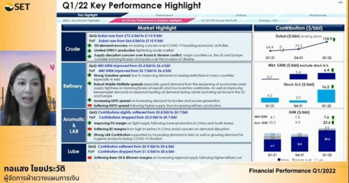 บริษัท ไทยออยล์ จำกัด (มหาชน) หรือ TOP เผยโครงการ CFP เปิดดำเนินการเชิงพาณิชย์ปี 2567 ล่าช้า 1 ปี เหตุจากผลกระทบโควิด-19 คาดผลประกอบการไตรมาส 2 ปี65 ดีต่อเนื่อง หลังประเมินว่า GRM ยังอยู่ในระดับที่ดี