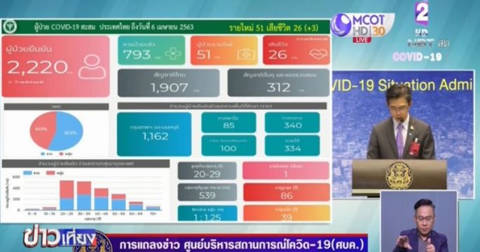 ศบค. แถลงสถานการณ์โควิด-19 พบผู้ป่วยใหม่ 51 ราย ผู้ป่วยสะสมเพิ่มขึ้นเป็น 2,220 ราย เสียชีวิตเพิ่ม 3 ราย เสียชีวิตสะสม 26 ราย รักษาหาย 119 ราย รักษาหายสะสม 793 ราย และยังรักษาอยู่ในโรงพยาบาล 1,401 ราย