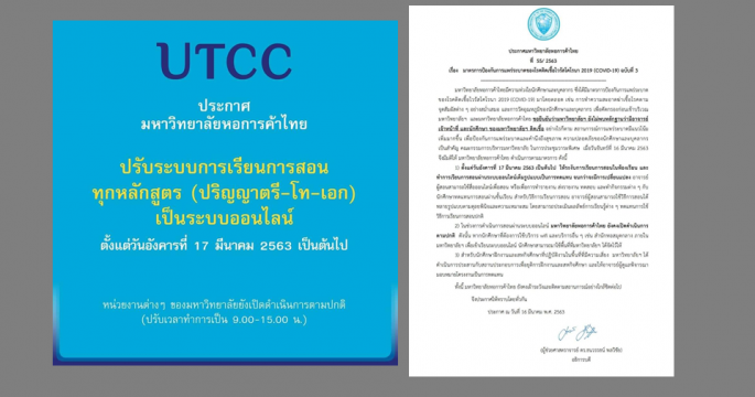 ม.หอการค้าไทย ประกาศแจ้งการเรียนการสอนผ่านระบบออนไลน์เต็มรูปแบบ เริ่มตั้งแต่พรุ่งนี้ (17มี.ค.) ยันขณะนี้ไม่มีอาจารย์ เจ้าหน้าที่ และนักศึกษาติดเชื้อดังกล่าว