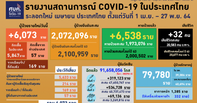 โควิดวันนี้ ติดเชื้อใหม่ 6,073 ราย ป่วยยืนยันสะสม 2,100,959 ราย หายกลับบ้าน 6,538 ราย เสียชีวิต 32 ราย