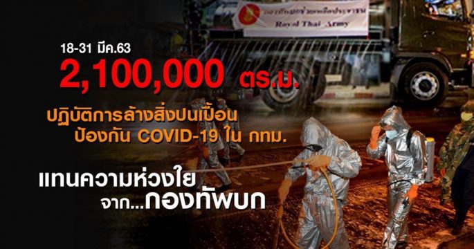กองทัพบกสรุป 15 วัน ปฏิบัติการล้างสิ่งปนเปื้อนป้องกันไวรัสโควิด ใน กทม. ครอบคลุมพื้นที่ 2.1 ล้าน ตร.ม. ส่วนชายแดนใต้ ปิดช่องทางเข้า-ออก สกัดโควิด มนโยบายรัฐ