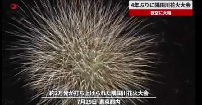 เทศกาลดอกไม้ไฟที่มีชื่อเสียงมากที่สุดงานหนึ่งของกรุงโตเกียวกลับมาจัดอีกเป็นครั้งแรกในรอบ 4 ปีเมื่อวานนี้ หลังจากมาตรการคุมเข้มป้องกันการระบาดของโควิด-19 ถูกยกเลิกไปแล้ว ทำให้ท้องฟ้าเหนือแม่น้ำซูมิดะ สว่างไสวสวยงามด้วยการแสดงพลุและดอกไม้ไฟ 20,000 ลูก