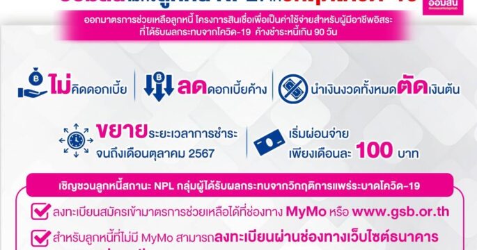 ออมสิน ไม่ทิ้งลูกหนี้ NPL ที่ได้รับผลกระทบจากวิกฤติโควิด-19 หรือ ลูกหนี้บัญชี 21 เร่งออกมาตรการช่วยเหลือ “ไม่คิดดอกเบี้ย-ลดดอกเบี้ยค้าง-นำเงินงวดทั้งหมดตัดเงินต้น” ให้เริ่มผ่อนจ่ายเดือนละ 100 บาท ตั้งเป้าดึงสถานะกลับมาเป็นลูกหนี้ปกติ