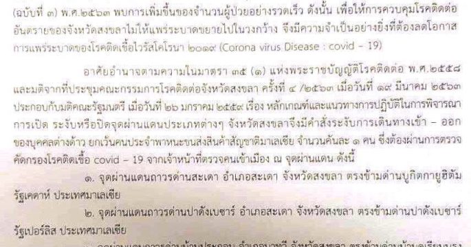ผลกระทบโควิด-19 ผู้ว่าฯ สงขลา ออกคำสั่งห้ามบุคคลต่างด้าวเข้า-ออกในราชอาณาจักร ณ จุดผ่านแดนถาวรจังหวัดสงขลา เป็นการชั่วคราว ตั้งแต่วันที่ 21 มี.ค.63 จนกว่าสถานการณ์จะกลับเข้าสู่ภาวะปกติ