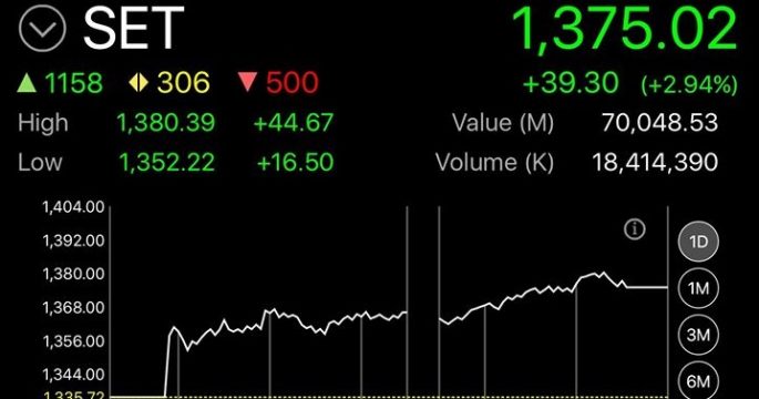 ตลาดหลักทรัพย์ปิดวันนี้ที่ระดับ 1,375.02 จุด เพิ่มขึ้น 39.30 จุด (+2.94%) มูลค่าการซื้อขาย 70,048.53 ล้านบาท