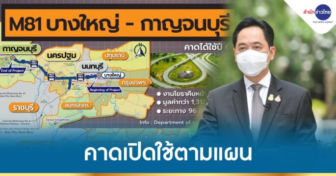 โฆษกรัฐบาลเผย โครงการมอเตอร์เวย์ สายบางใหญ่-กาญจนบุรี ระยะทาง 96.4 กม. การก่อสร้างงานโยธาคืบหน้า 83% ก่อสร้างงานระบบแล้ว 6 ด่าน คาดแล้วเสร็จตามแผน สามารถเปิดให้บริการในปี 2567
