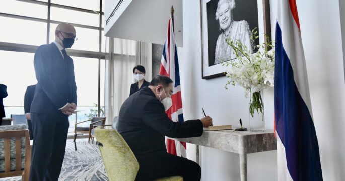 โฆษกรัฐบาลเผยข้อความสารแสดงความเสียใจของ”พล.อ.ประวิตร” ถึงนายกรัฐมนตรีสหราชอาณาจักร ต่อการเสด็จสวรรคตของสมเด็จพระราชินีนาถเอลิซาเบธที่ 2 ด้าน “พล.อ.ประยุทธ์” พร้อมภริยา ร่วมลงนามแสดงความเสียใจที่สถานทูตอังกฤษด้วย