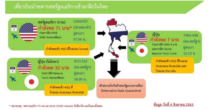 กรุงเทพฯ 4 ส.ค.- นพ.ทวีศิลป์ วิษณุโยธิน โฆษกศูนย์บริหารสถานการณ์การแพร่ระบาดของโรคติดเชื้อไวรัสโคโรนา 2019 (โควิด-19) หรือ ศบค. ยอมรับ แถลงข้อมูลกำลังพลจากสหรัฐฯ ที่เดินทางจากญี่ปุ่น มาเข้าร่วมการฝึก Balance Torch และการฝึก HMA ของกองทัพบก โดยจะเข้าพักในสถานที่กักกันทางเลือก หรือ Alternative State Quarantine ที่โรงแรมอนันตรา สยาม เมื่อวานนี้ (3 ส.ค.) คลาดเคลื่อน โดยกำลังพลดังกล่าวจะเข้าพักที่โรงแรมอนันตรา ริเวอร์ไซด์ และวันนี้ (4 ส.ค.) ได้แถลงแก้ไขข้อมูลดังกล่าวแล้ว .- สำนักข่าวไทย