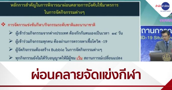 โฆษก ศบค. เปิดเผยถึงมาตรการผ่อนคลายการจัดการแข่งขันกีฬา ผู้เข้าร่วมกิจกรรมจากต่างประเทศจะต้องกักตัว 14 วัน ผู้เข้าร่วมกิจกรรมทุกคนต้องผ่านการตรวจเชื้อโควิด-19 และยังไม่อนุญาตให้มีผู้ชม