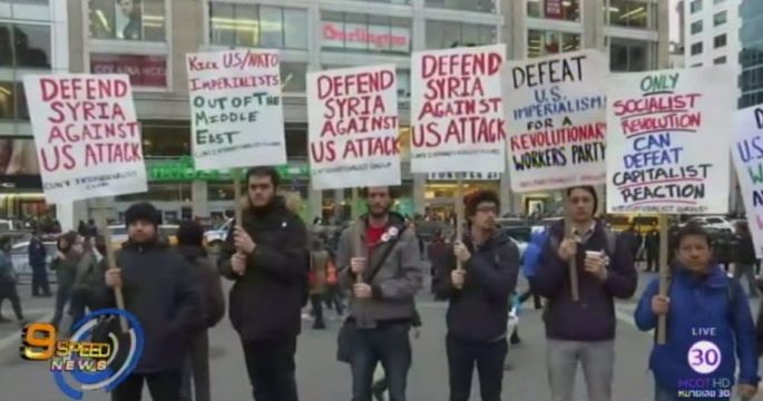 ผู้ประท้วงจำนวนมากรวมตัวกันในนครนิวยอร์ก เพื่อแสดงพลังต่อต้านปฏิบัติการทางอากาศของสหรัฐที่โจมตีเป้าหมายทางทหารของซีเรีย