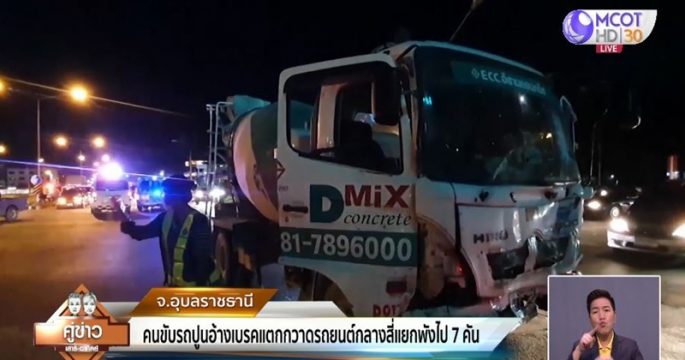 รถบรรทุกปูนพุ่งชนรถยนต์กลางสี่แยกไฟแดง พังเสียหาย 7 คัน บาดเจ็บ 5 คน คนขับเมา อ้างเพิ่งซ่อมรถมาใหม่ก่อนเบรกแตก วัดแอลกอฮอล์พุ่ง 220 มิลลิกรัมเปอร์เซ็นต์ ตำรวจแจ้งข้อหาขับรถขณะเมาสุรา