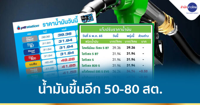 ผู้ค้าแจ้งปรับขึ้นราคาน้ำมันกลุ่มเบนซินและแก๊สโซฮอล์ทุกชนิด 80 สตางค์/ลิตร ส่วน E85 ปรับขึ้น 50 สตางค์/ลิตร ขณะที่กลุ่มดีเซลทุกชนิด ราคาคงเดิม มีผลพรุ่งนี้ 7 พ.ค.