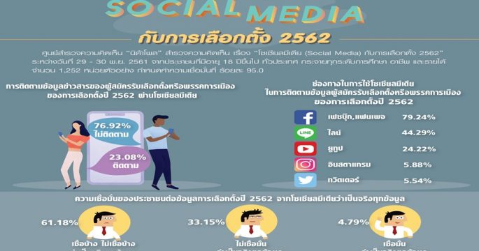 นิด้าโพล เผยประชาชนส่วนใหญ่ไม่ได้ติดตามการเลือกตั้งผ่านโซเชียลมีเดีย เชื่อบ้างไม่เชื่อบ้างว่าเป็นจริงทุกข้อมูล