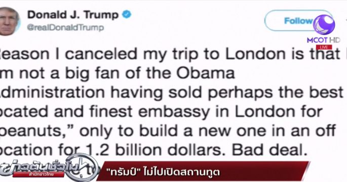 โดนัลด์ ทรัมป์ ทวีตชี้แจงเหตุผลกรณีระงับการเดินทางไปเปิดสถานทูตสหรัฐแห่งใหม่ที่กรุงลอนดอนในเดือนหน้า ยันไม่เห็นด้วยกับการที่อดีตประธานาธิบดีบารัค โอบามา ขายสถานทูตเดิมบริเวณจัตุรัสกรอสเวอเนอร์