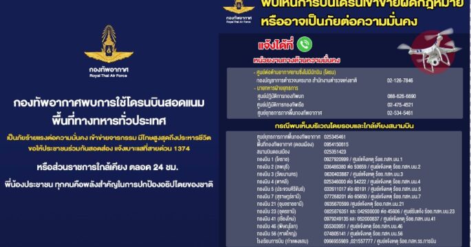 2 ส.ค. – กองทัพอากาศ พบโดรนบินที่ตั้งทหาร-หน่วยงานราชการจำนวนมากหลายพื้นที่ ชี้ภัยร้ายแรง พยายามสอดแนม หากประชาชนพบเห็นขอให้แจ้งเบาะแส กองทัพอากาศ โพสต์เฟซบุ๊กระบุว่า ได้ตรวจพบความพยายามในการใช้โดรนบินสำรวจที่ตั้งทางทหารและหน่วยงานราชการจำนวนมากในหลายพื้นที่ที่สำคัญของประเทศไทย ซึ่งถือเป็นภัยร้ายแรงที่ส่อให้เห็นถึงความพยายามในการสอดแนม เพื่อกระทำการสิ่งใดสิ่งหนึ่งที่เป็นอันตรายต่อโครงสร้างพื้นฐานทางทหารและอาจรวมถึงโครงสร้างพื้นฐานพลเรือน เจ้าหน้าที่ฝ่ายทหารและหน่วยงานด้านความมั่นคงที่ได้รับมอบหมาย มีอำนาจในการใช้ระบบ Anti Drone ในการทำลายเป้าหมายได้ทันที และผู้ที่กระทำผิด จะเข้าข่ายความผิดฐานจารกรรม/สายลับ ที่กระทบต่อความมั่นคงแห่งราชอาณาจักร มีบทลงโทษรุนแรง ถึงขั้นจำคุกตลอดชีวิตหรือประหารชีวิต ปัจจุบัน สถานการณ์ความขัดแย้งระหว่างไทย กัมพูชา ยังคงต้องเฝ้าระวัง โดรนคือภัยคุกคามที่ร้ายแรงและส่งผลกระทบต่อความมั่นคงและชีวิตประชาชน กองทัพอากาศจึงขอความร่วมมือประชาชนทุกท่านที่พบเห็นหรือทราบเบาะแสเกี่ยวกับการบินของโดรน รวมทั้งผู้ที่บังคับโดรน ที่อาจฝ่าฝืนกฎหมายได้แจ้งสายด่วนความมั่นคง 1374 หรือหน่วยงานราชการใกล้เคียง ได้ตลอด 24 ชั่วโมง. – 313 สำนักข่าวไทย