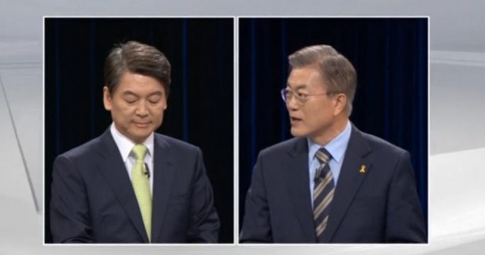 นายอัน ชอลซูและนายมุน แจอิน 2 ผู้สมัครตัวเก็งในการชิงตำแหน่งประธานาธิบดีเกาหลีใต้เปิดฉากโต้วาทีแสดงวิสัยทัศน์ทางโทรทัศน์ในประเด็นการติดตั้งระบบทาด