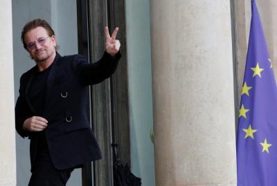 โบโน นักร้องนำของยูทู สุดยอดวงร็อคจากไอร์แลนด์ และผู้ก่อตั้งองค์กรวัน (ONE) ที่รณรงค์ต่อสู้กับความยากจนและโรคร้าย พบหารือกับประธานาธิบดีเอ็มมานูเอล มาครง