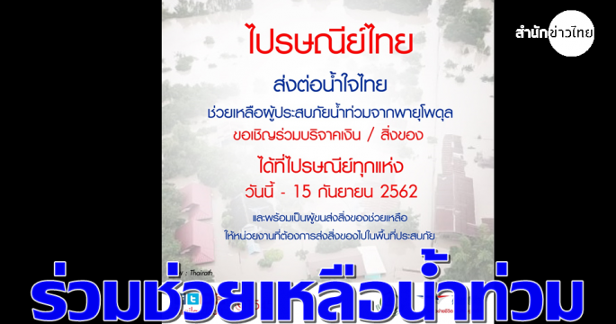 ไปรษณีย์ไทยระดมความช่วยเหลือผ่านการบริจาคเงิน-สิ่งของเครื่องใช้ให้ผู้ประสบภัยจากพายุ ‘โพดุล’ ร่วมบริจาคเงินได้ที่เคาน์เตอร์-กล่องรับบริจาค ไปรษณีย์ทั่วประเทศ
