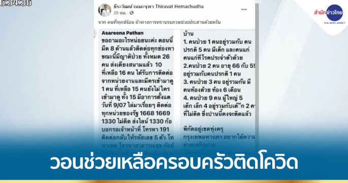 “หมอธีระวัฒน์” โพสต์ข้อความจากผู้ใช้เฟซบุ๊กรายหนึ่งขอความช่วยเหลือครอบครัวติดโควิด 26 คน สามารถช่วยได้แล้ว 11 คน ยังเหลืออีก 15 คน พิกัดทุ่งครุ แถมอยู่รวมกับคนปกติ