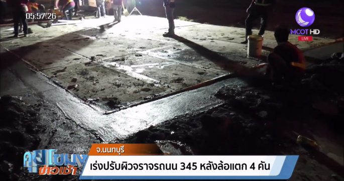 ผู้รับเหมาเข้าปรับผิวจราจรถนนสาย 345 ปทุมธานี-บางบัวทอง ต.คลองข่อย อ.ปากเกร็ด จ.นนทบุรี หลังถูกถ่ายรูปโพสต์โซเชียลระบุถนนดังกล่าวทำรถล้อแตกไปแล้ว 4 คัน