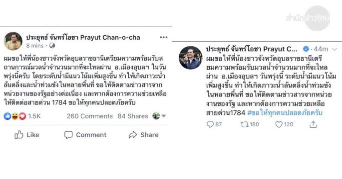 กรุงเทพฯ 12 ก.ย.- พล.อ.ประยุทธ์ จันทร์โอชา นายกรัฐมนตรี โพสต์ข้อความผ่านโซเชียลมีเดีย ทั้งเฟซบุ๊ก และทวิตเตอร์ “ประยุทธ์ จันทร์โอชา Prayut Chan-o-cha” มีข้อความว่า “ผมขอให้พี่น้องชาวจังหวัดอุบลราชธานีเตรียมความพร้อมรับสถานการณ์มวลน้ำจำนวนมากที่จะไหลผ่าน อ.เมืองอุบลฯ ในวันพรุ่งนี้ครับ โดยระดับน้ำมีแนวโน้มเพิ่มสูงขึ้น ทำให้เกิดภาวะน้ำล้นตลิ่งและน้ำท่วมขังในหลายพื้นที่ ขอให้ติดตามข่าวสารจากหน่วยงานของรัฐอย่างต่อเนื่อง และหากต้องการความช่วยเหลือ ให้ติดต่อสายด่วน 1784 ขอให้ทุกคนปลอดภัยครับ” . – สำนักข่าวไทย