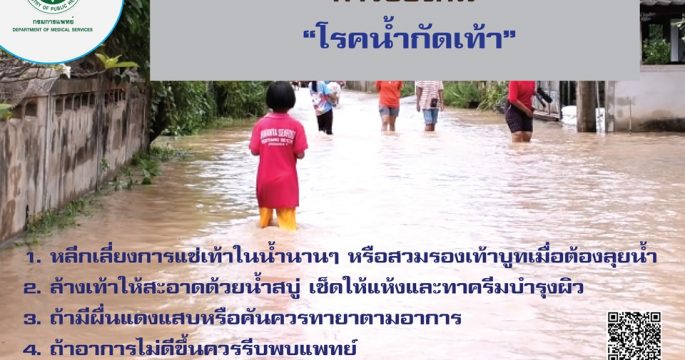 ห่วงประชาชนในพื้นที่น้ำท่วม หลีกเลี่ยงการแช่เท้าในน้ำนานๆ หรือสวมรองเท้าบูทเมื่อต้องลุยน้ำ ล้างเท้าให้สะอาดด้วยน้ำสบู่เช็ดให้แห้งอยู่เสมอ ป้องกันโรคน้ำกัดเท้า