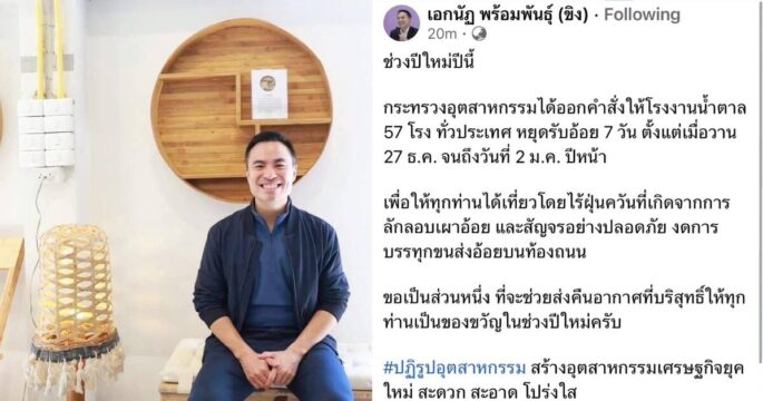 “เอกนัฏ” สั่งโรงงานน้ำตาลทั่ว ปท. หยุดรับอ้อย 7 วัน เพื่อมอบอากาศบริสุทธิ์ให้คนไทย-นักท่องเที่ยวในช่วงปีใหม่