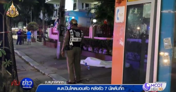 มอบตัวแล้วดาบตำรวจหึงโหด ยิงคนขับรถส่งสินค้าเสียชีวิตหน้าโรงพักสมุทรสาคร หลังจับได้แอบคุยกับภรรยา แต่ผู้ต้องหายังให้การภาคเสธ ต้นสังกัดให้ออกจากราชการไว้ก่อน