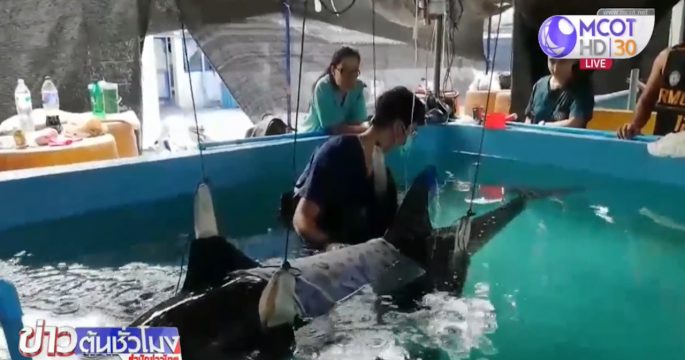 ชาวบ้านและเจ้าหน้าที่อุทยานแห่งชาติหาดเจ้าไหม จ.ตรัง ช่วยกันผลักดันโลมาปากขวด อายุประมาณ 2 ปี กลับลงสู่ทะเล หลังขึ้นมาเกยตื้นบริเวณหาดสั้น แต่ไม่สำเร็จ