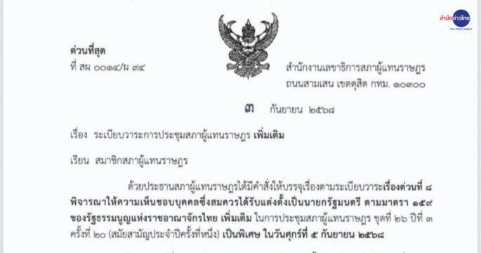 สภาบรรจุระเบียบวาระเลือกนายกฯ 5 ก.ย.นี้