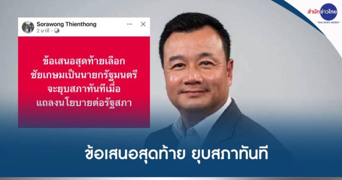 รัฐสภา 4 ก.ย.-“สรวงศ์” เผยข้อเสนอสุดท้าย เลือก“ชัยเกษม” นั่งนายกฯ ยุบสภาทันที เมื่อเวลา 11.12 น. นายสรวงศ์ เทียนทอง รัฐมนตรีว่าการกระทรวงการท่องเที่ยวและกีฬา ในฐานะเลขาธิการพรรคเพื่อไทย โพสต์ข้อความผ่านเฟซบุ๊กส่วนตัว ระบุว่า “ข้อเสนอสุดท้ายเลือกนายชัยเกษม นิติสิริ เป็นนายกรัฐมนตรีจะยุบสภาทันทีเมื่อแถลงนโยบายต่อรัฐสภา”.-316.-สำนักข่าวไทย
