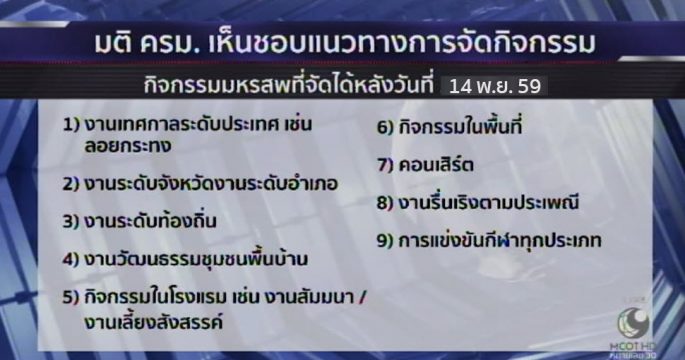 มติคณะรัฐมนตรีให้จัดงานมหรสพได้ 9 รูปแบบ หลังจากวันที่ 14 พ.ย.นี้เป็นต้นไป ขณะที่นายกฯ ให้สื่อโทรทัศน์และวิทยุจัดผังรายการตามปกติได้
