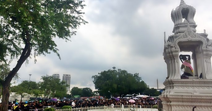 ประชาชนจำนวนมากรอเข้ากราบถวายบังคมพระบรมศพในหลวงรัชกาลที่ 9 ท่ามกลางสภาพอากาศร้อนจัด ขณะที่มีจิตอาสาทยอยแจกน้ำและอาหารอย่างต่อเนื่อง