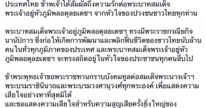 แถลงจากใจนายกฯ ห่วงคนไทยเศร้าโศก อาลัย ขอให้กำลังใจทำหน้าที่ตนให้ดีที่สุด และขอให้ทุกคนช่วยกันทำความดีถวายอย่างไม่หยุดยั้ง
