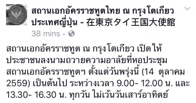 สถานเอกอัครราชทูต ณ กรุงโตเกียว เปิดให้ประชาชนลงนามถวายความอาลัยที่หอประชุม