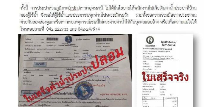อุดรธานี 5 ก.ค.- ระวัง! กปภ.อุดรฯ ย้ำเตือนอย่าเชื่อเด็ดขาดบุคคลอ้างเป็น จนท.เก็บเงินค่าน้ำตามบ้านหรือร้านค้า ออกใบเสร็จปลอม หลังมีผู้เสียหายแล้ว ยันไม่มีนโยบายส่ง จนท.ออกไปรับชำระเงินถึงที่ ด้านตำรวจจับตาสงสัยเป็นรายเดียวที่ก่อเหตุเมื่อปีที่แล้วย้อนกลับมาอีก น.ส.สุพรรณี ศักดิ์สุจริต ผู้จัดการการประปาส่วนภูมิภาค จ.อุดรธานี ออกประกาศเตือนผ่านทางเฟซบุ๊กของ กปภ.อุดรธานี พร้อมภาพถ่ายบุคคลที่แอบอ้างเป็นเจ้าหน้าที่เรียกเก็บเงินจากผู้ใช้น้ำตามบ้านพัก ร้านค้า และสำนักงาน ล่าสุดได้รับแจ้งจากผู้ใช้น้ำ 3 รายว่ามีบุคคลแอบอ้างกระทำการดังกล่าวและมีผู้หลงเชื่อจ่ายเงินไปให้แล้ว โดยได้รับใบเสร็จปลอม จึงให้ผู้เสียหายไปแจ้งความไว้ที่ สภ.เมืองอุดรธานี น.ส.สุพรรณี กล่าวว่า ฝ่ายนิติกรกำลังตรวจสอบว่าการกระทำของผู้แอบอ้าง และปลอมแปลงเอกสาร มีความผิดข้อกฎหมายใดบ้าง เพื่อ กปภ.อุดรธานี จะไปแจ้งความดำเนินคดี หรือฟ้องร้องที่ทำให้หน่วยงานเสียหาย ขอย้ำว่า กปภ.ใช้วิธีส่งใบแจ้งเตือนชำระค่าน้ำประปาเท่านั้น เพื่อให้นำใบดังกล่าวไปชำระเงินตามช่องทางที่ถูกต้อง ทั้งนี้ กปภ.ไม่มีนโยบายให้พนักงานไปเก็บเงินค่าน้ำประปาที่บ้านของผู้ใช้น้ำ พร้อมขอความร่วมมือสอดส่องดูแล หรือหากพบเหตุการณ์เช่นนี้ไม่ควรจ่ายเงินให้ผู้แอบอ้าง และควรรีบโทรศัพท์สอบถามข้อมูลหมายเลข 042-222733 และ 042-247974 นางสาวเดือน อายุ 28 ปี นักกายภาพบำบัด หนึ่งในผู้เสียหายเล่าว่า ช่วงค่ำวันที่ 29 […]