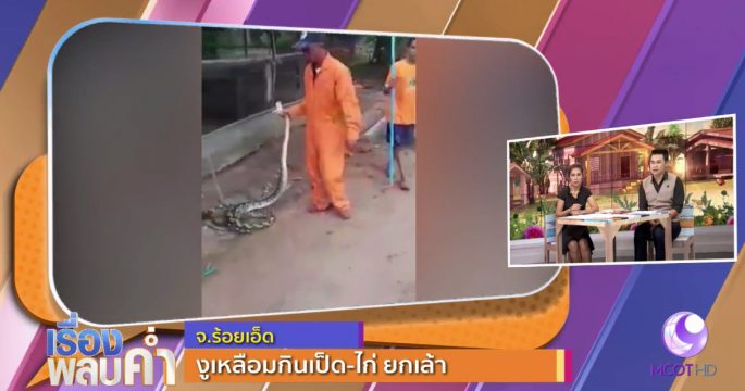 งูเหลือมขนาดใหญ่ยาวเกือบ 5 เมตร กินเป็ดและไก่ของนายสินธุ์ เวียงสิมา ชาวร้อยเอ็ด ยกเล้ารวมกว่า 60 ตัว