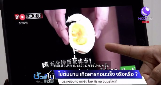 กรุงเทพฯ 23 ม.ค.-บนสังคมออนไลน์แชร์คลิปเตือนว่า การต้มไข่นานๆ ทำให้เกิดสารประกอบกำมะถัน อาจทำให้เป็นมะเร็งลำไส้ เรื่องนี้จริงหรือไม่ ? ติดตามจากศูนย์ชัวร์ก่อนแชร์