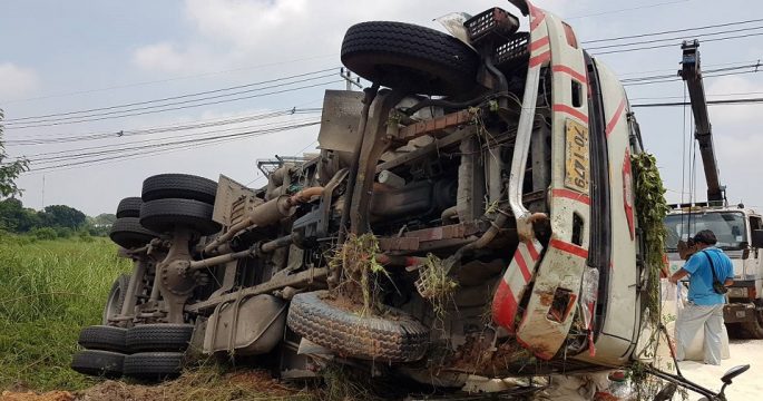 โชเฟอร์สิบล้อง่วงขับรถไถลพลิกข้างถนนอ่างทอง