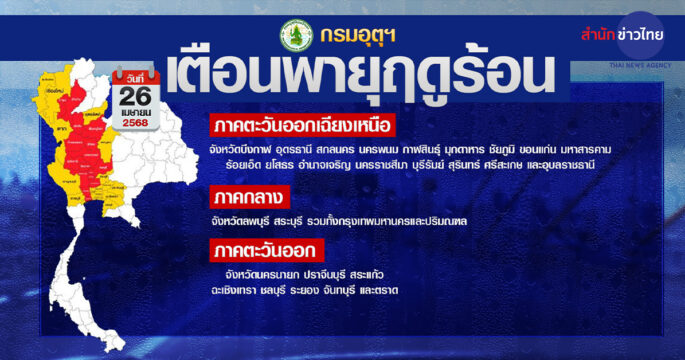 กรมอุตุฯ เตือนไทยตอนบนเตรียมรับมือพายุฤดูร้อน 26 เม.ย.-1 พ.ค.นี้ ขอให้ประชาชนระวังอันตรายจากฝนฟ้าคะนอง ลมกระโชกแรง ลูกเห็บตก และฟ้าผ่าบางพื้นที่