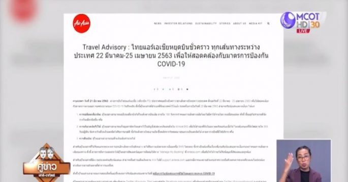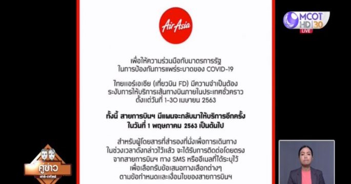 พิษ COVID-19 ส่งผลกระทบหนักต่อกิจการสายการบิน ล่าสุดไทยแอร์เอเชีย แจ้งหยุดบริการบินต่างประเทศเป็นการชั่วคราว ส่วนในประเทศยังให้บริการ โดยก่อนหน้านี้ไลอ้อนแอร์แจ้งยุติการให้บริการทุกเส้นทาง