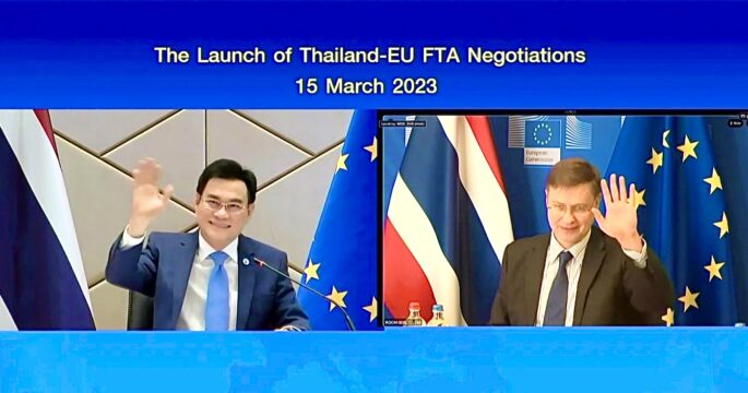 นนทบุรี 15 มี.ค.-รมว.พณ.เปิดประชุมข้ามประเทศผ่านระบบ VC นับหนึ่งเจรจาภายใต้กรอบ FTA ไทย-อียู อย่างเป็นทางการเพื่อสร้างแต้มต่อ ”สินค้า-บริการ-ลงทุน” ไทยกับ 27 ประเทศสมาชิกสหภาพยุโรป เดินหน้าสร้างเงิน สร้างอนาคตประเทศ