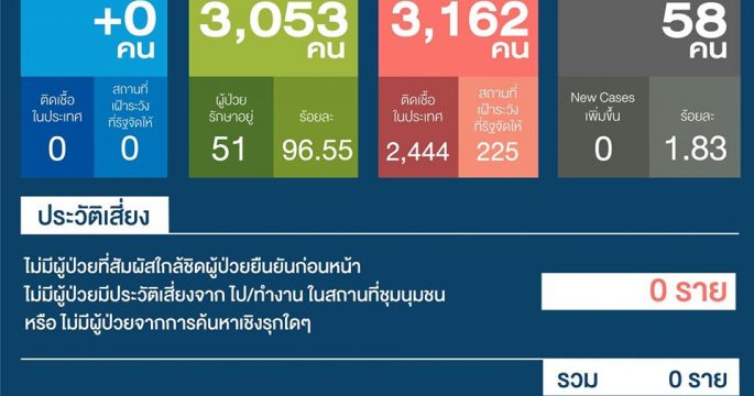 สถานการณ์โรคโควิด-19 ไทยพบผู้ป่วยรายใหม่ 0 ราย สะสม 3,162 ราย หายป่วยเพิ่ม 13 ราย รักษาใน รพ. 51 ราย เสียชีวิตคงที่