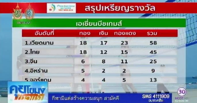 ผลการแข่งขันกีฬาเอเชี่ยนบีชเกมส์ ครั้งที่ 5 ที่เมืองดานัง ประเทศเวียดนาม โดยไทยหล่นไปรั้งอันดับ 2 บนตารางเหรียญ