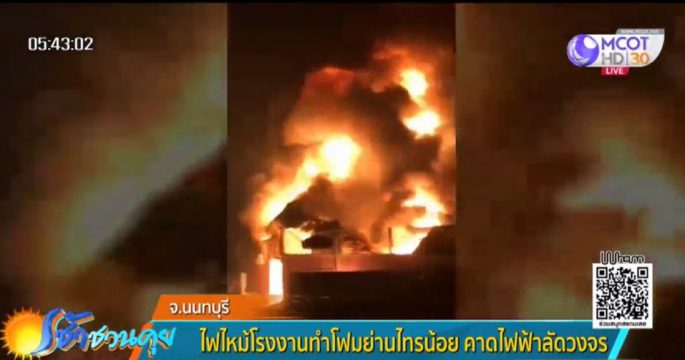 เหตุไฟไหม้โรงงานทำโฟมใหญ่ย่านไทรน้อย จ.นนทบุรี เมื่อคืนที่ผ่านมา เจ้าหน้าที่ระดมฉีดน้ำประมาณ 30 นาที เพลิงจึงสงบ สาเหตุคาดเกิดจากไฟฟ้าลัดวงจร มีผู้ได้รับบาดเจ็บ 2 คน เบื้องต้นอาการปลอดภัย