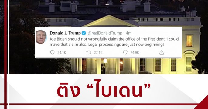 ประธานาธิบดีโดนัลด์ ทรัมป์ ทวิตข้อความติงนายโจ ไบเดน คู่แข่งจากพรรคเดโมแครต ว่าไม่ควรอ้างชัยชนะการเลือกตั้งประธานาธิบดี