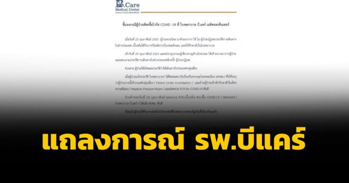 รพ.บีแคร์ ออกแถลงการณ์ พบผู้ป่วยติดเชื้อโควิด-19 แต่เจ้าตัวปกปิดข้อมูลประวัติเดินทางต่างประเทศ ส่งผลให้บุคลากร-รพ.กลายเป็นกลุ่มเสี่ยง ต้องเฝ้าระวัง