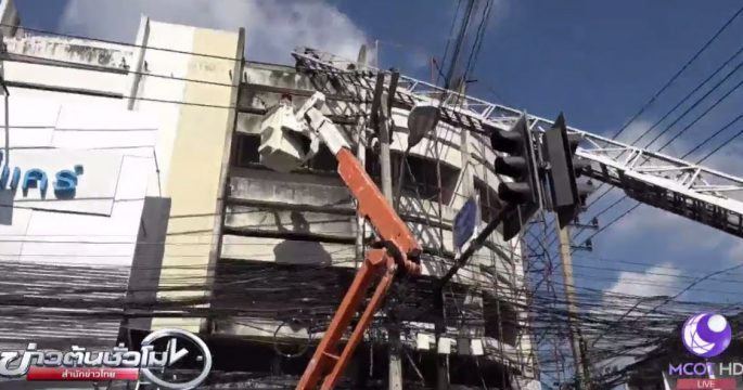 ไฟช็อตช่างติดตั้งป้ายโฆษณาขนาดใหญ่บริเวณสี่แยกวัดม่วง กลางเมืองนครราชสีมา เสียชีวิต 1 เพื่อนร่วมงานเจ็บอีก 4