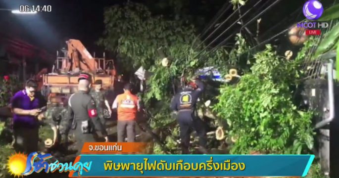 เกิดพายุฝนฟ้าคะนองในพื้นที่ จ.ขอนแก่น ทำให้ต้นไม้ขนาดใหญ่ล้มทับเสาส่งไฟฟ้าแรงสูงเสียหายหลายสิบต้น ส่งผลไฟฟ้าดับเป็นบริเวณกว้าง