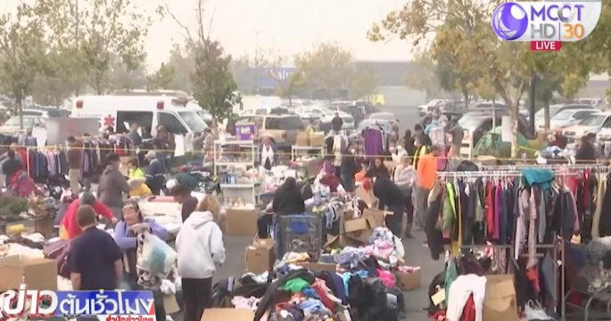 จำนวนผู้อพยพหนีไฟป่าครั้งรุนแรงในรัฐแคลิฟอร์เนียของสหรัฐ เพิ่มจำนวนขึ้นอย่างต่อเนื่อง โดยผู้อพยพจำนวนหนึ่งต้องไปนอนค้างอ้างแรมกันที่ลานจอดรถของซูเปอร์มาร์เก็ตแห่งหนึ่ง เพื่อรอรับบริจาคเสื้อผ้า อาหาร และ สิ่งของยังชีพอื่นๆ